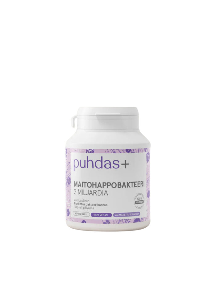 Puhdas+ Piimhappebakterid 2 miljardit on igapรคevaseks kasutamiseks mรตeldud probiootiline toidulisand, mis sisaldab nelja inimesele omast piimhappebakteri tรผve. Iga kapsel sisaldab 2 miljardit elujรตulist bakterit (CFU โ kolooniaid moodustavad รผhikud), mis aitavad hoida ja toetada soolestiku mikrofloora tasakaalu.