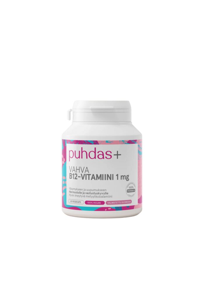 Puhdas+ Vahva B12-vitamiin 1 mg toetab normaalset energiavahetust ja aitab vรคhendada vรคsimust ning kurnatust. B12-vitamiin toetab ka nรคrvisรผsteemi ja psรผhholoogiliste funktsioonide normaalset toimimist. Tootes sisalduv metรผรผlkobalamiin on B12 aktiivne ja hรคsti imenduv vorm. Kapslid on puhta koostisega โ ei sisalda sรคilitusaineid, magusaineid ega allergeene ning sobivad ka veganitele. 60 kapslit pakendis tรคhendab kahe kuu jagu igapรคevast tuge, lihtsalt ja tรตhusalt.